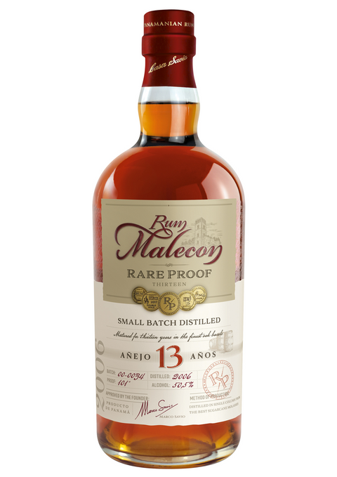 Ron Malecon 13 år 50,5% Rare Proof med to glas,, er den yngste udgave af Malecons Rare-proof-serie vi har i Danmark. Den er ligesom mange af de andre Malecon rom intens i både duft og smag, det er en flot videreudvikling af en 13 års rom og den ekstra alkohol giver en ekstra intens og lækker smag. Der er noter af saltkaramel, toffee, butterscotch og et hint af røg samt vanilje. Der er en meget velintegreret alkohol og der er masser af dejlige fadnoter, egetræet kommer flot igennem, og rommen har det klassiske cubanske tørre præg uden at være ude af balance. Der er en dejlig sødmefuldhed, som balanceres ud af alkoholen og generelt er det bare et lækkert glas rom. Denne rom har masser af kant og kan med fordel bruges til cocktails hvor der skal lidt nedvanding til, eks. old fashioned. Pynt gerne med appelsinskal.