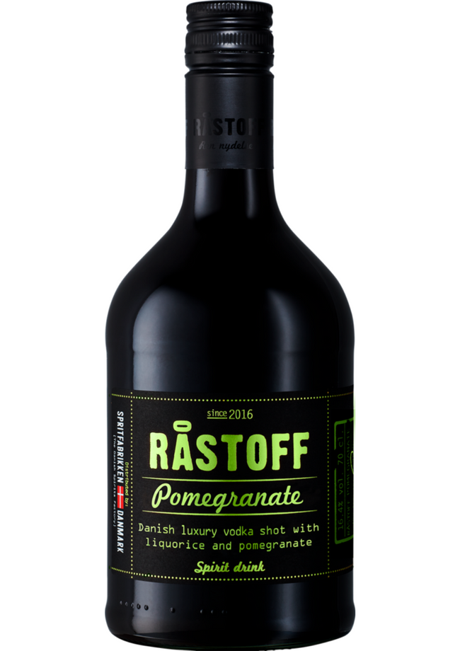 Som de øvrige varianter i Råstoff serien er Råstoff Pomegranate af høj kvalitet lavet på en base af vodka tilsat nøje udvalgte ingredienser. Der bruges ægte lakridspulver udvundet fra lakridsrod, hvis oprindelse kan dateres helt tilbage til 1930. Råstoff Pomegranate har en delikat og fyldig smag af lakrids og granatæble...